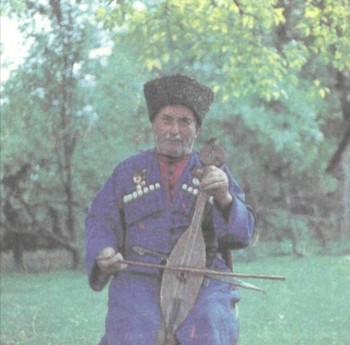 Абхаз в традиционном костюме играет на национальном музыкальном инструменте.